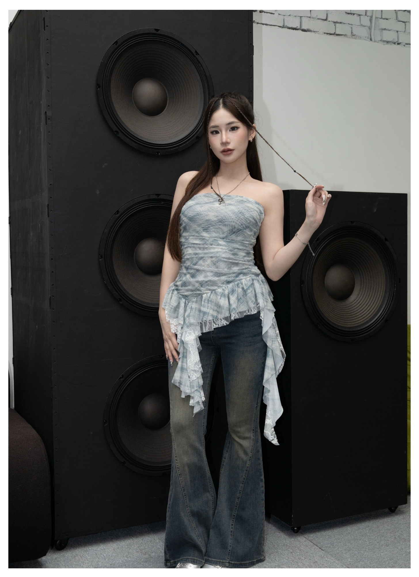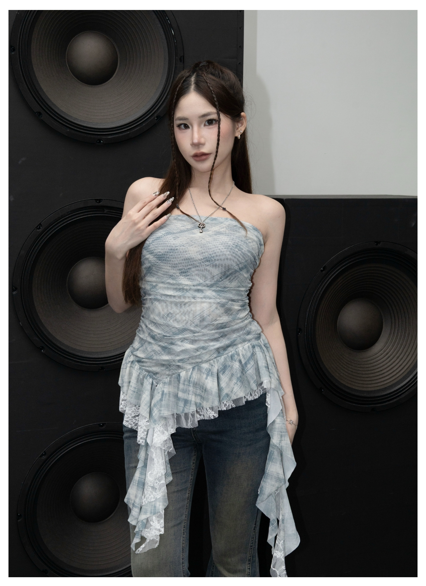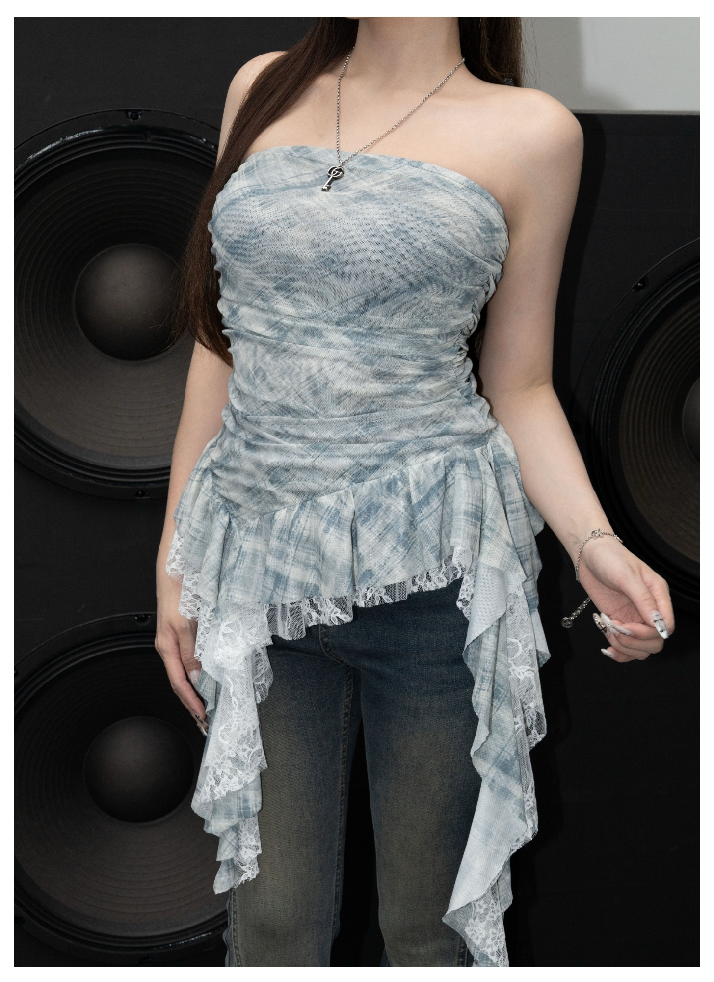 格紋蕾絲平口網紗上衣