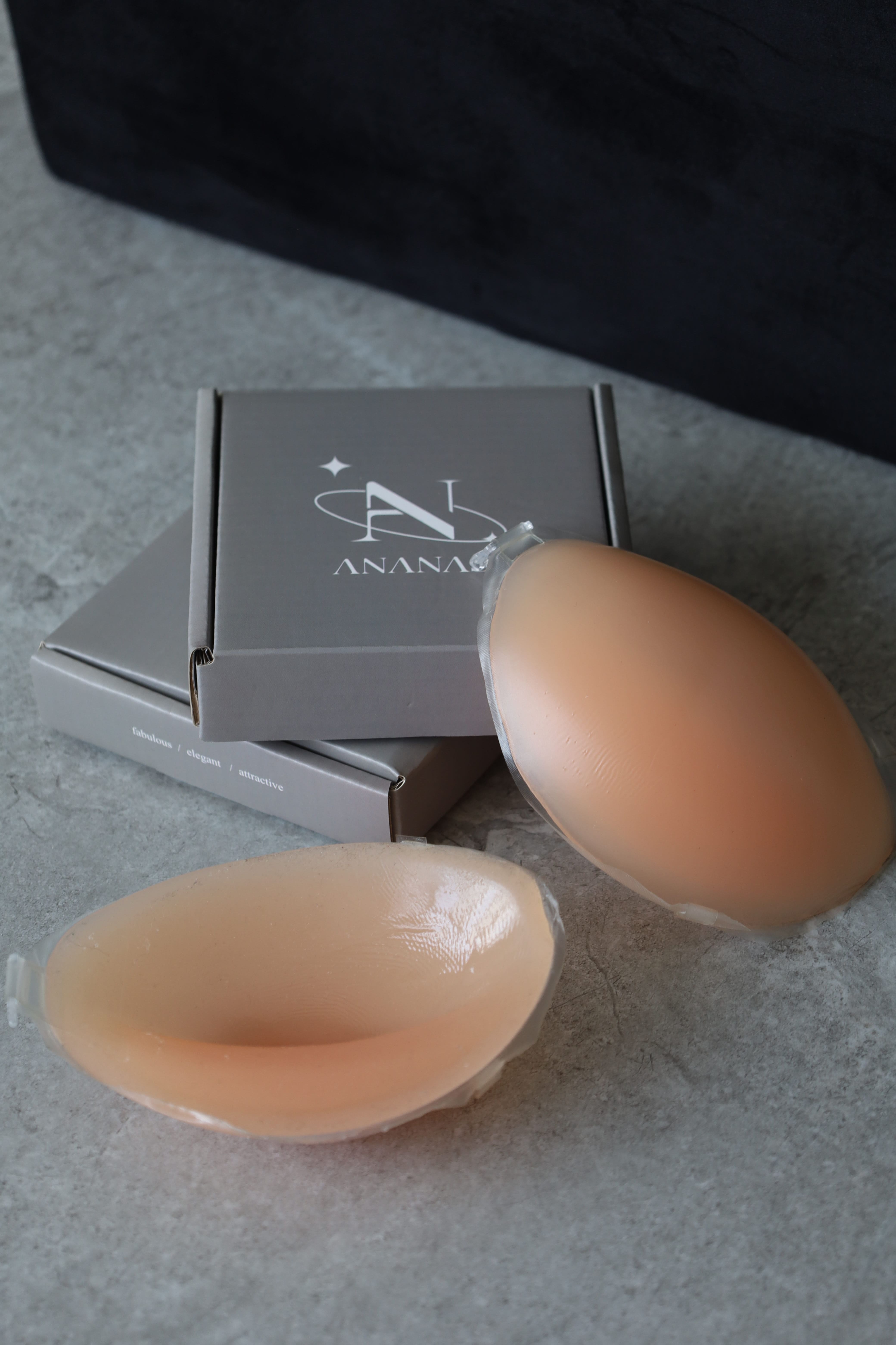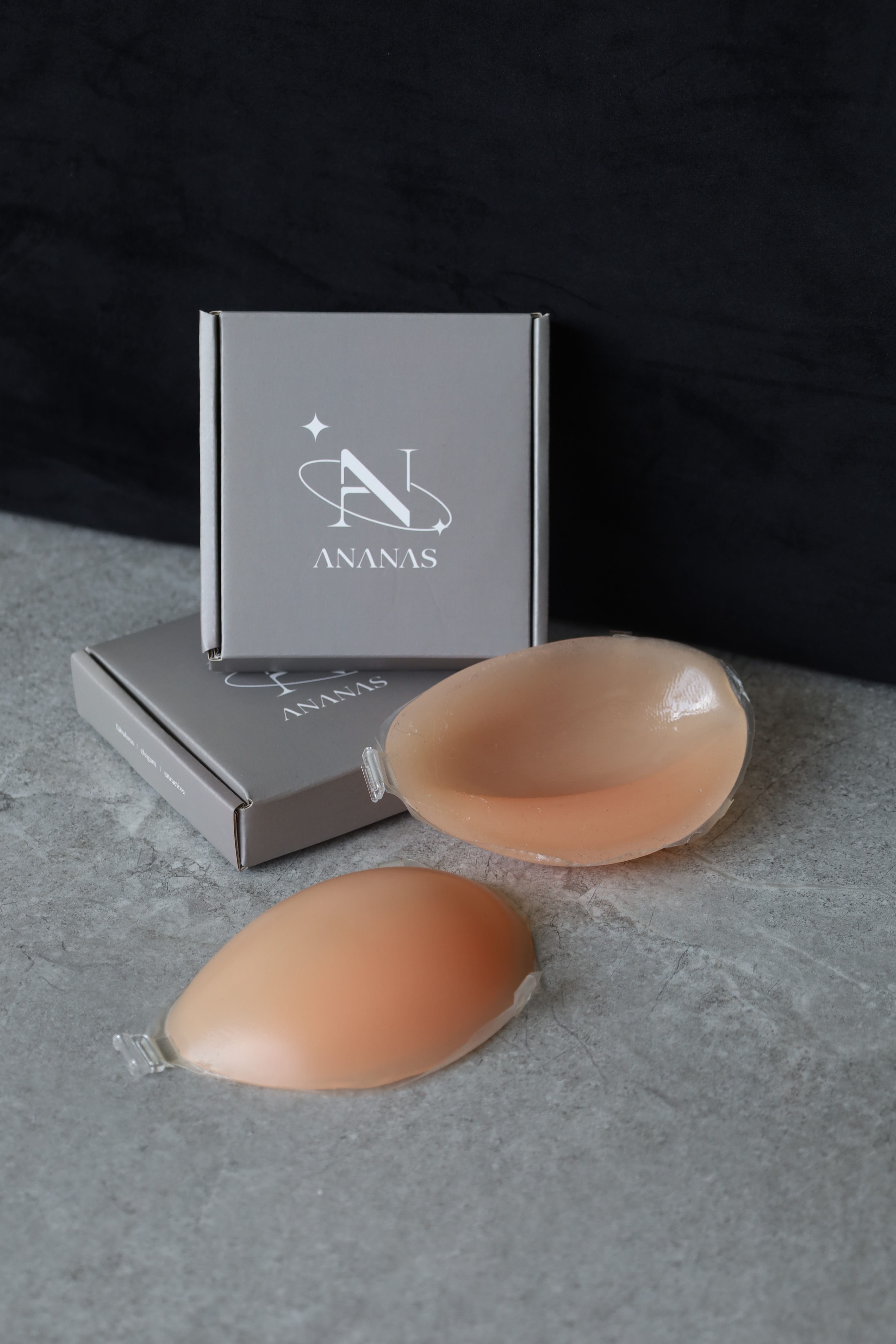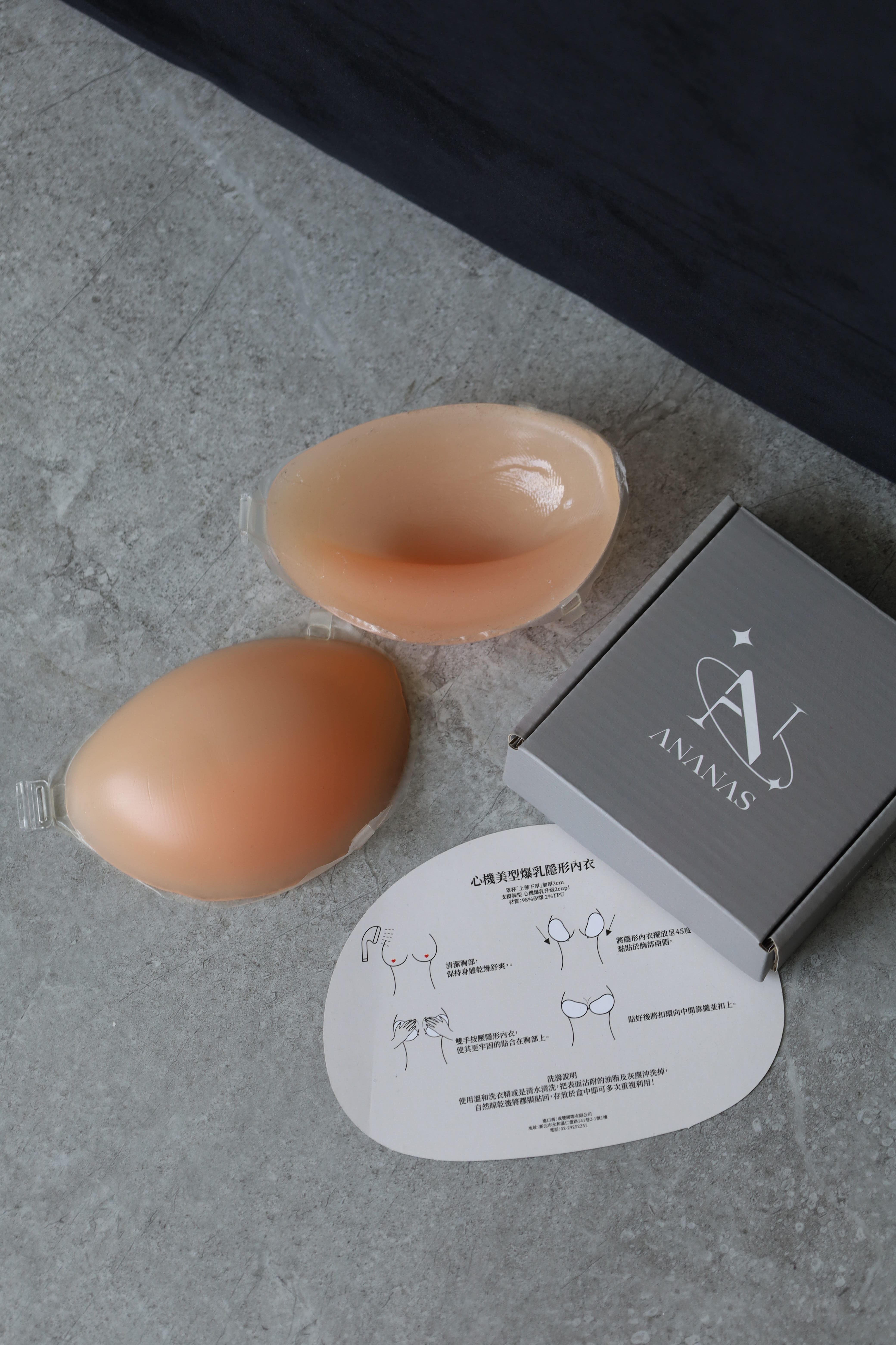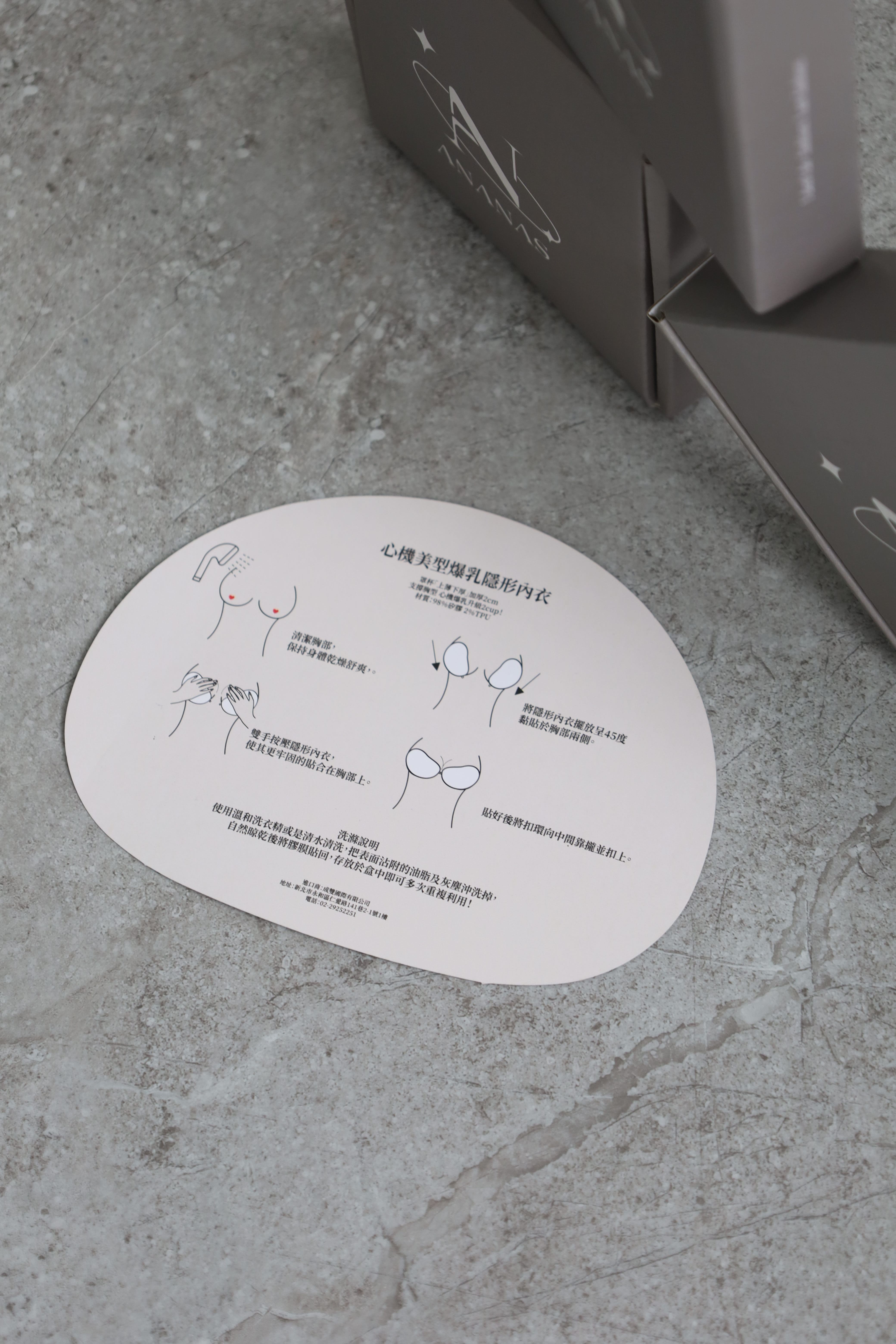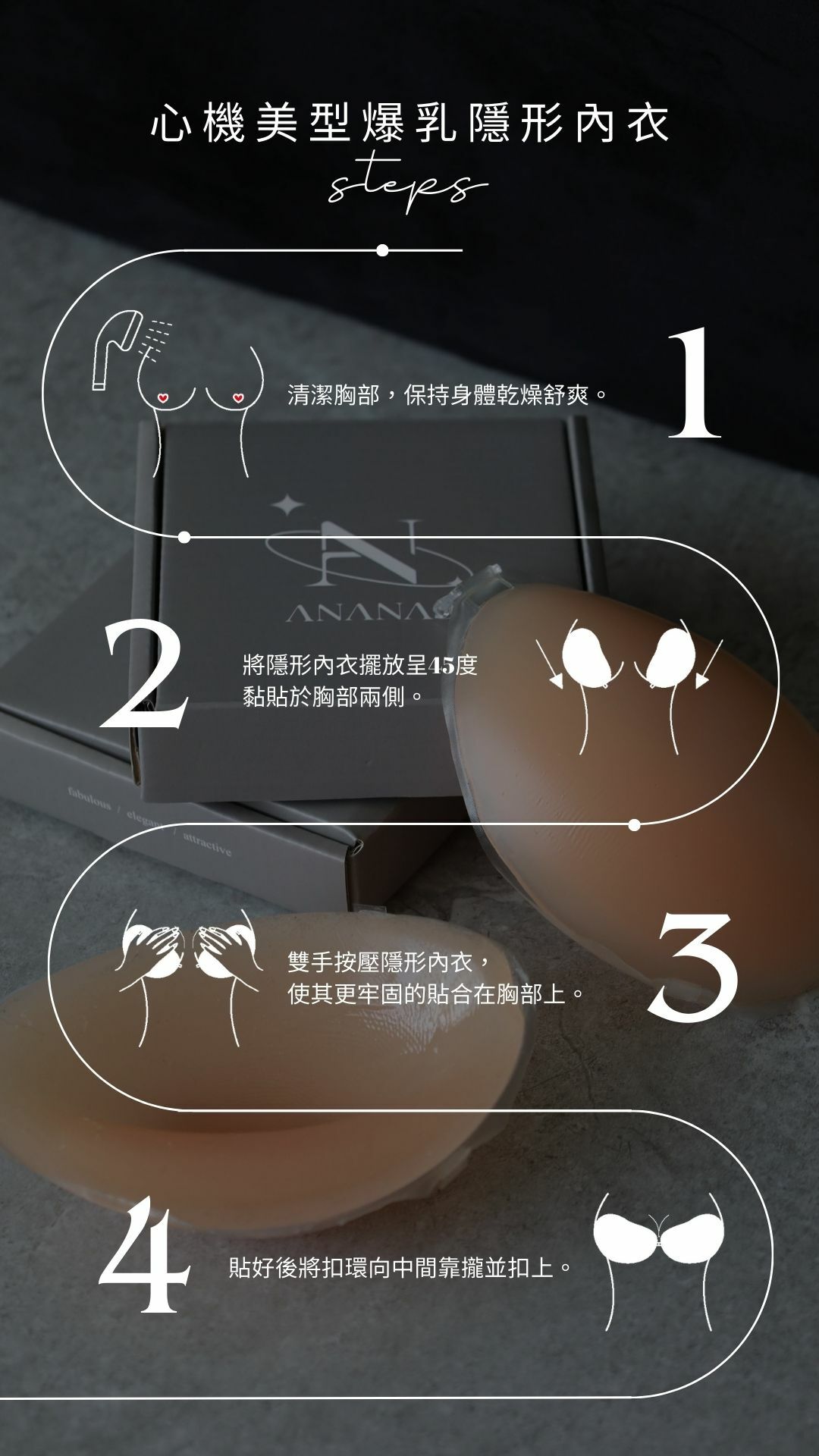 將隱形內衣擺放呈45度黏貼於胸部兩側。