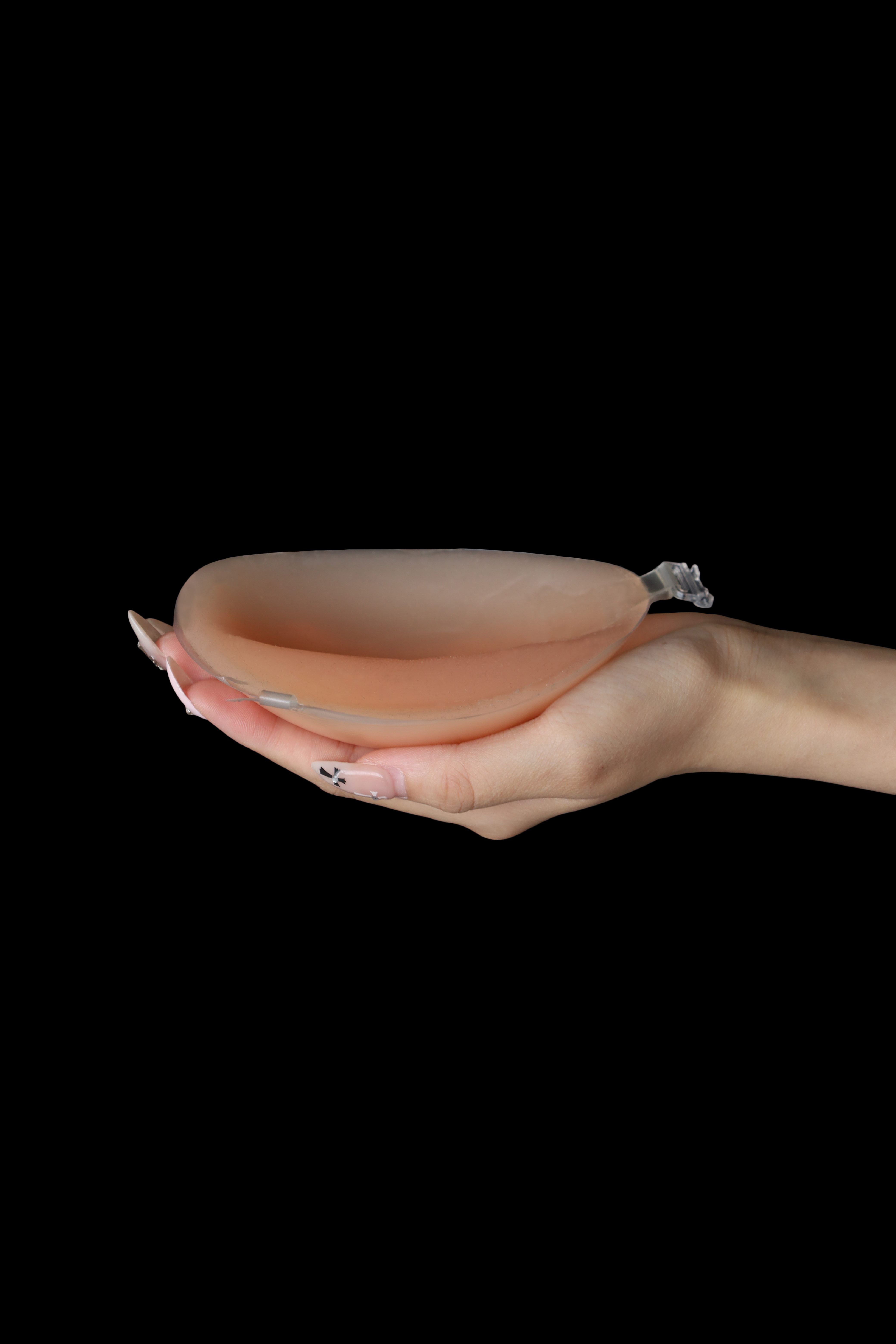 雙手按壓隱形內衣,使其更牢固的貼合在胸部上。